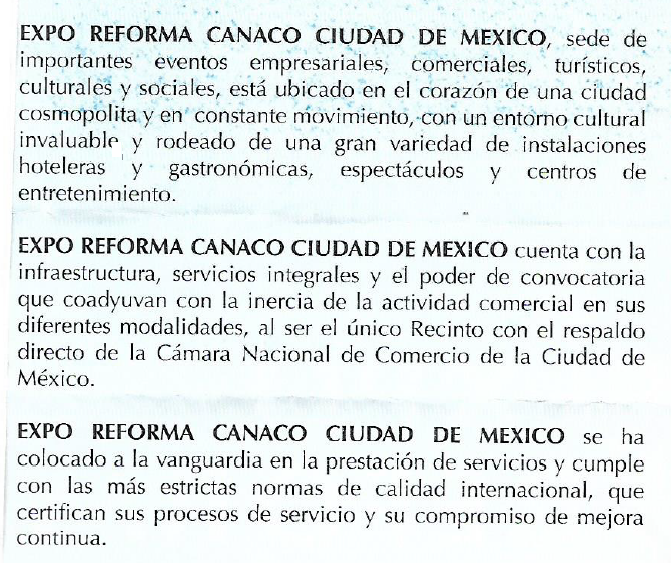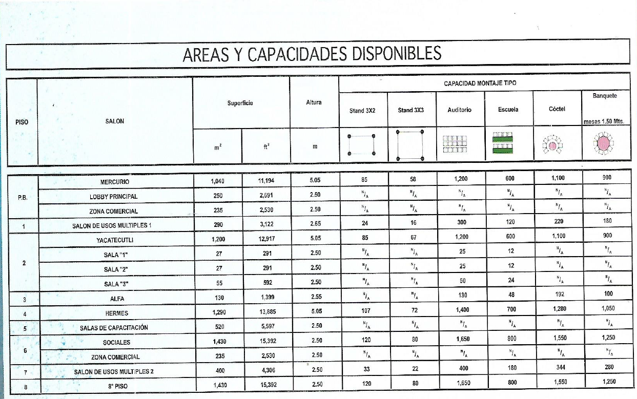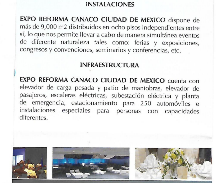 cuadrados de exhibición que puede albergar hasta 750 “stands” así como 21 salones de uso múltiple. Los otro cuatro grandes centros de exhibición son: el Auditorio Nacional, el de la Cámara de Comercios Servicios y Turismo de la Ciudad de México, el Salón de Congresos del Centro Siglo XXI, del IMSS, y el “United States of America Trade Center”.